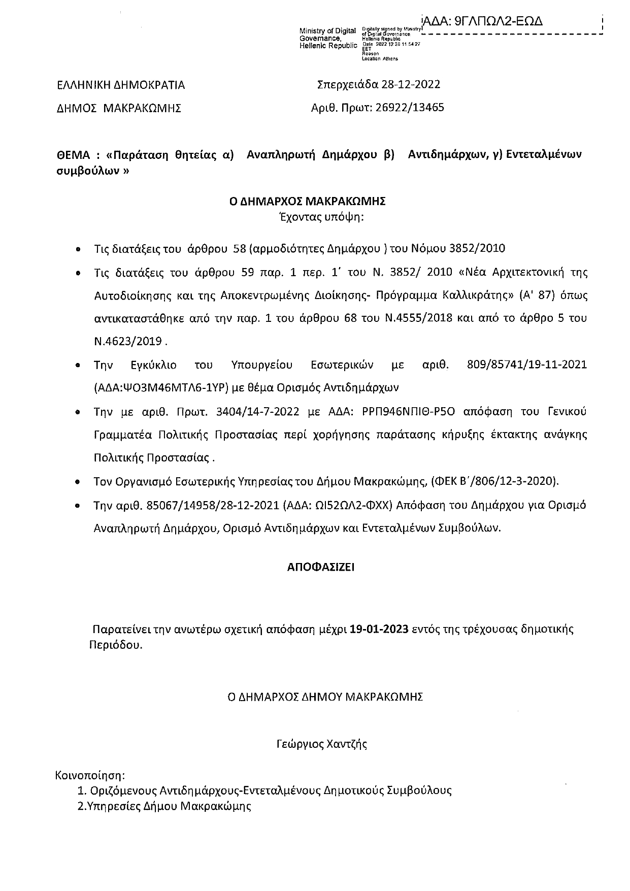 Παράταση θητείας α) Αναπληρωτή Δημάρχου β) Αντιδημάρχων γ) Εντεταλμένων συμβούλων