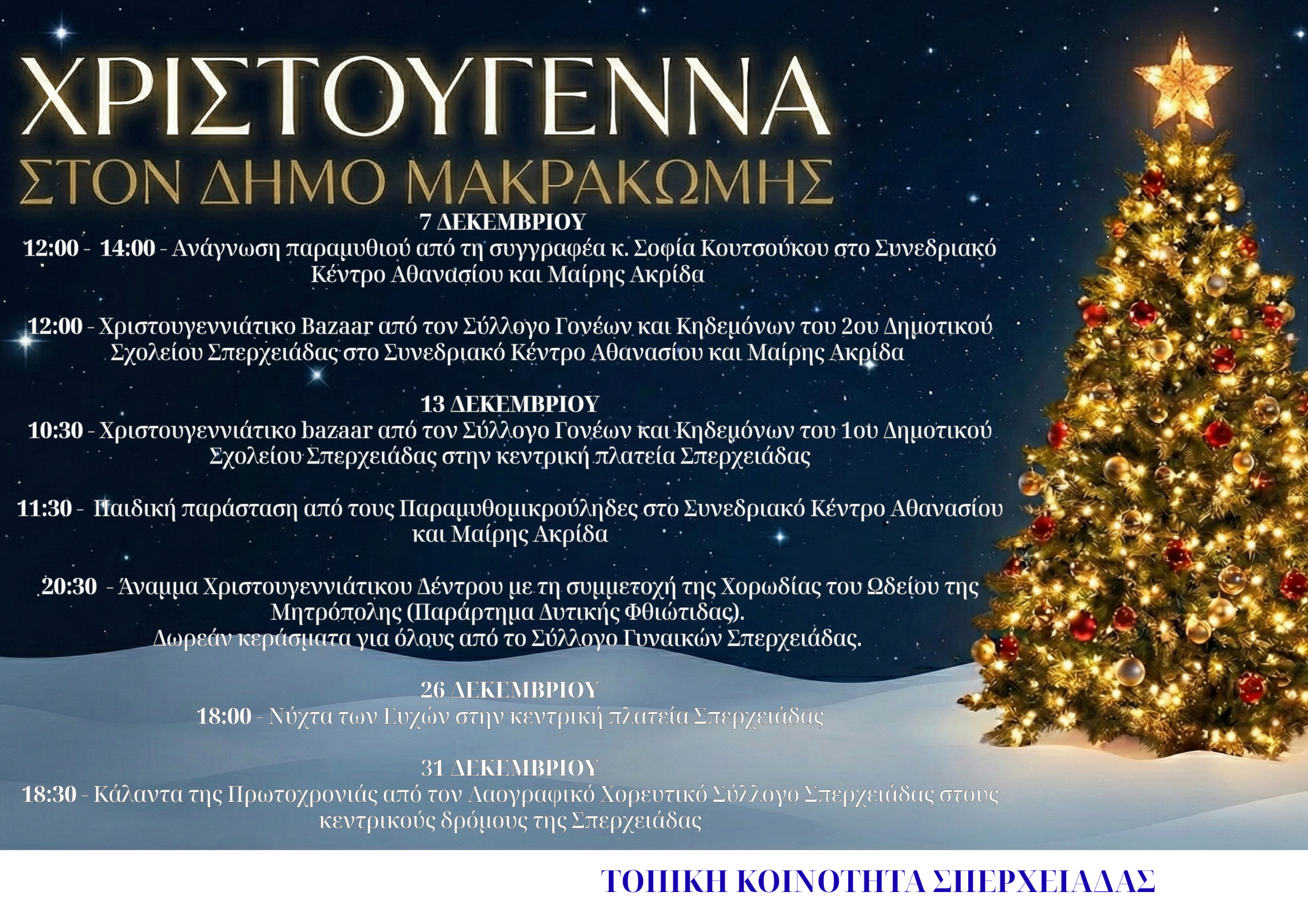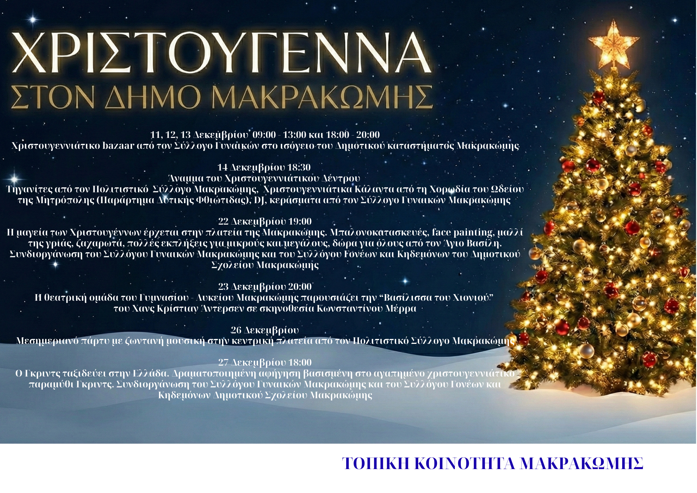 Ελάτε να απολαύσουμε παρέα διασκεδαστικά δρώμενα, δημιουργικά εργαστήρια, μελωδικά κάλαντα και πολλές εκπλήξεις που θα ζεστάνουν τις καρδιές μας.