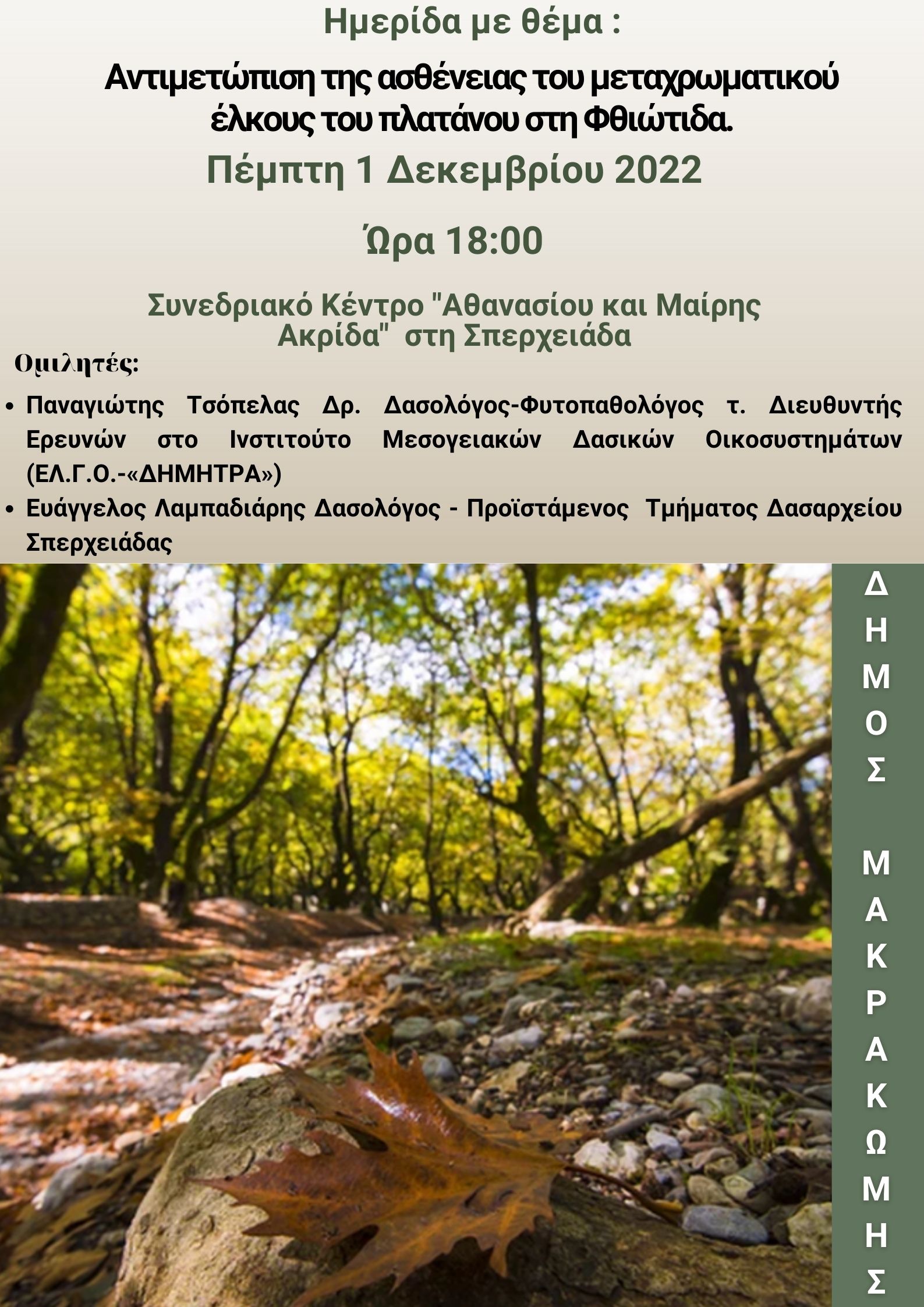 Ο Δήμος Μακρακώμης την Πέμπτη 1 Δεκεμβρίου 2022 διοργανώνει Ημερίδα με θέμα : Μεταχρωματικό έλκος του πλατάνου, μια καταστρεπτική ασθένεια που απειλεί με αφανισμό τα πλατάνια της Φθιώτιδας.