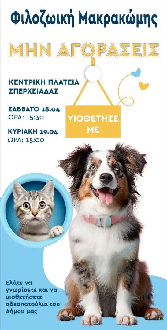 Στο πλαίσιο του Circus Street Food Festival, που θα πραγματοποιηθεί στις 18 & 19 Απριλίου 2026 στην κεντρική πλατεία Σπερχειάδας, διοργανώνεται δράση υιοθεσίας αδέσποτων ζώων σε συνεργασία με τη Φιλοζωϊκή Μακρακώμης.