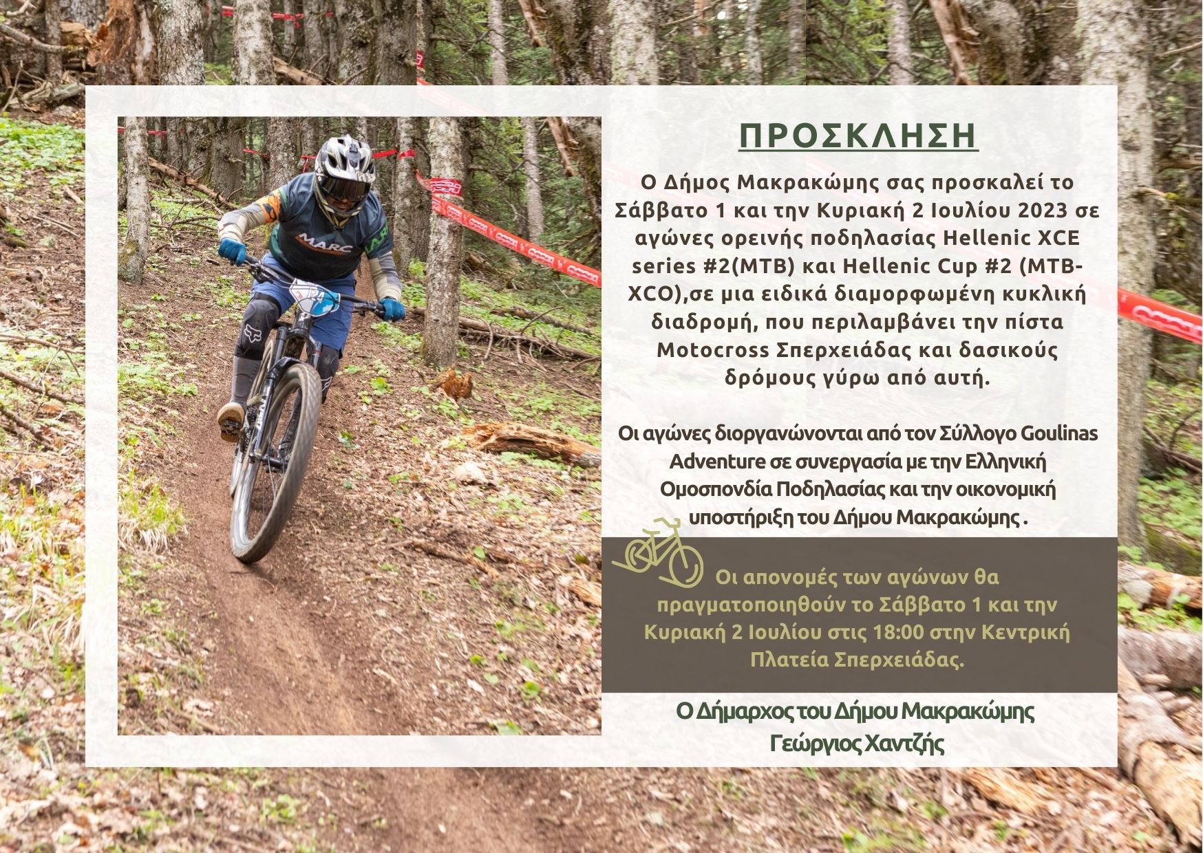 Το Σάββατο 1 και την Κυριακή 2 Ιουλίου 2023 στην πίστα Motocross Σπερχειάδας και στις γύρω δασικές διαδρομές θα διεξαχθεί, σε διοργάνωση του υπερδραστήριου Συλλόγου Goulinas adventure, σε συνεργασία με την Ελληνική Ομοσπονδία Ποδηλασία και με την οικονομική υποστήριξη του Δήμου Μακρακώμης, το Hellenic XCE series #2(MTB) και Hellenic Cup #2 (MTB-XCO).