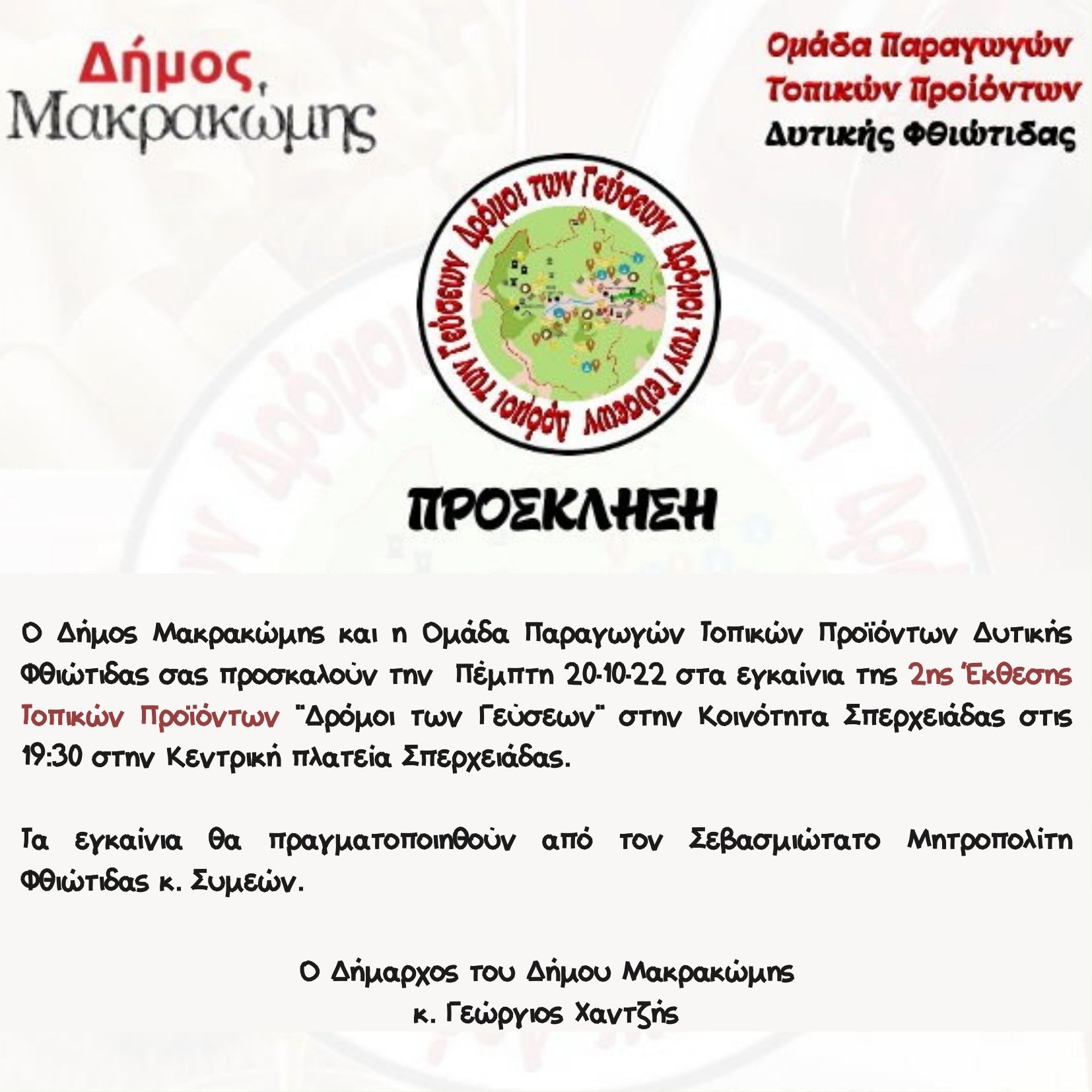 Ο Δήμος Μακρακώμης και η Ομάδα Παραγωγών Τοπικών προϊόντων Δυτικής Φθιώτιδας διοργανώνουν την 2η έκθεση τοπικών προϊόντων «Δρόμοι των Γέυσεων».