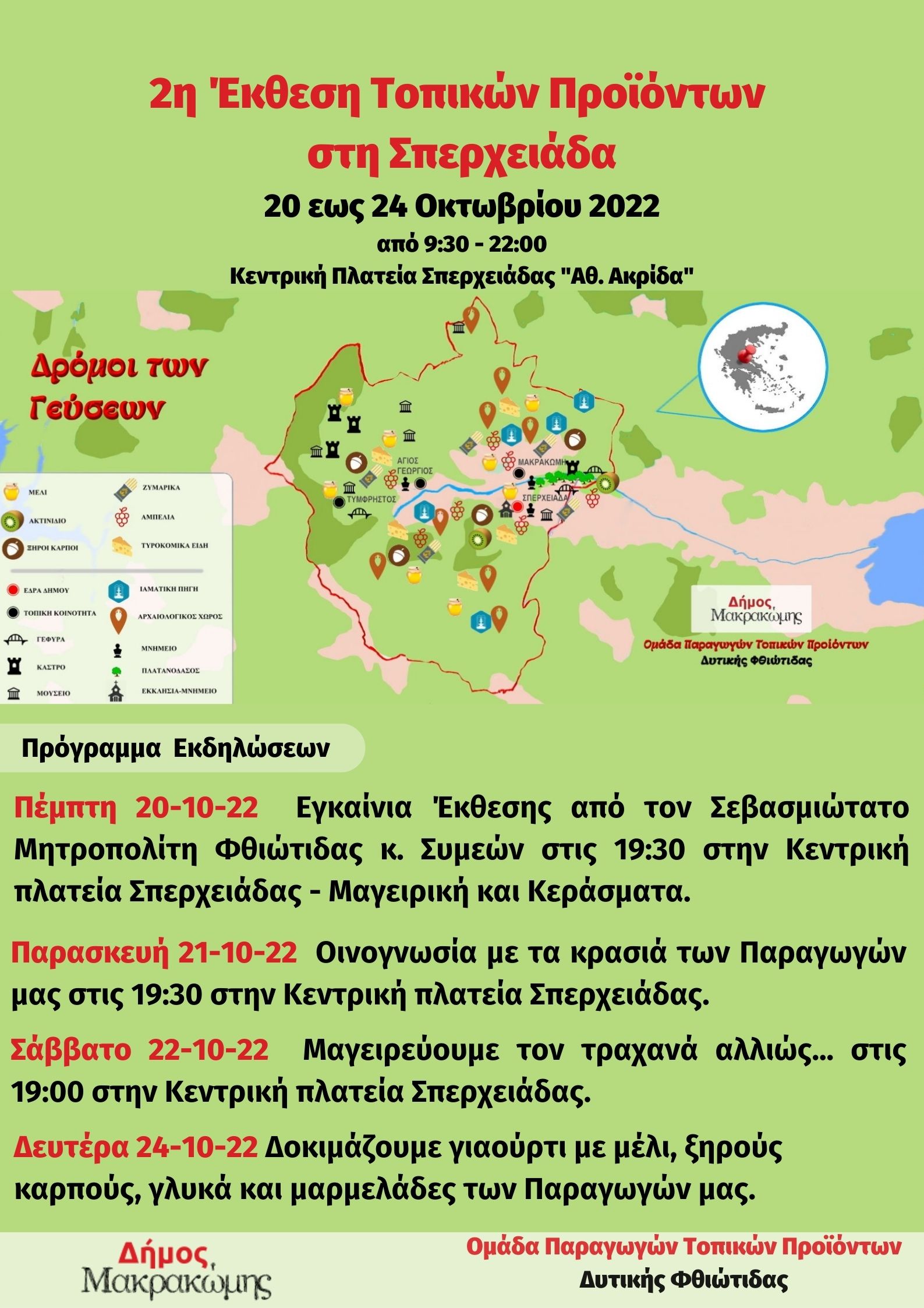 Η έκθεση θα λειτουργεί παράλληλα με το παζάρι της Σπερχειάδας στην Κεντρική πλατεία Σπερχειάδας από 20 έως 24 Οκτωβρίου και ώρες 9:30 εως 22:00.