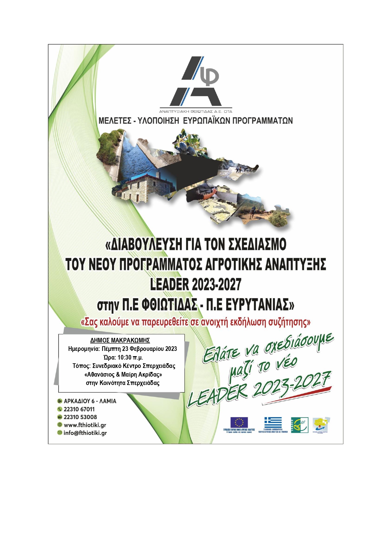 Ημερίδα για την ενημέρωση του τοπικού πληθυσμού για το νέο Τοπικό Πρόγραμμα LEADER ΣΣ ΚΑΠ 2023-2027 για την Π.Ε Φθιώτιδας και Π.Ε Ευρυτανίας
