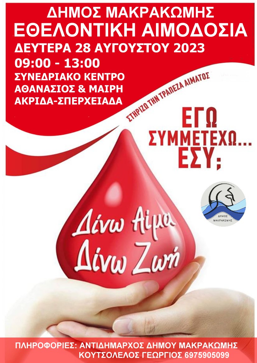 Ο Δήμος Μακρακώμης σε συνεργασία με την Υπηρεσία Αιμοδοσίας του Γ.Ν. Λαμίας, σας προσκαλεί σε μια ένδειξη καλής θελήσεως και αλληλεγγύης, συνδράμοντας όλοι μαζί στην δυναμική προσπάθεια, να ενισχύσουμε την τράπεζα αίματος του Δήμου μας, συμμετέχοντας στην εθελοντική αιμοδοσία, που θα πραγματοποιηθεί στις 28/08/2023 , στο Συνεδριακό Κέντρο «Αθανασίου και Μαίρης Ακρίδα» στην Κοινότητα Σπερχειάδας.
