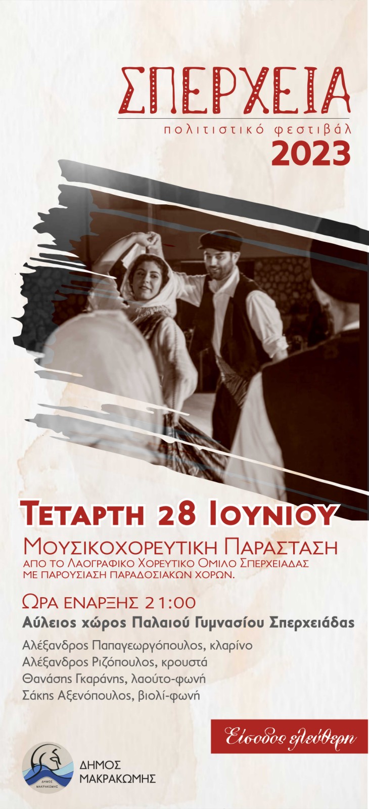 Το πολιτιστικό Φεστιβάλ “Σπέρχεια”, που αποτελεί θεσμό 30 και πλέον χρόνων για την Κοινότητα Σπερχειάδας ανοίγει την αυλαία του για το 2023, την Τετάρτη 28 Ιουνίου, με την Μουσικοχορευτική παράσταση του Λαογραφικού Χορευτικού Ομίλου Σπερχειάδας.