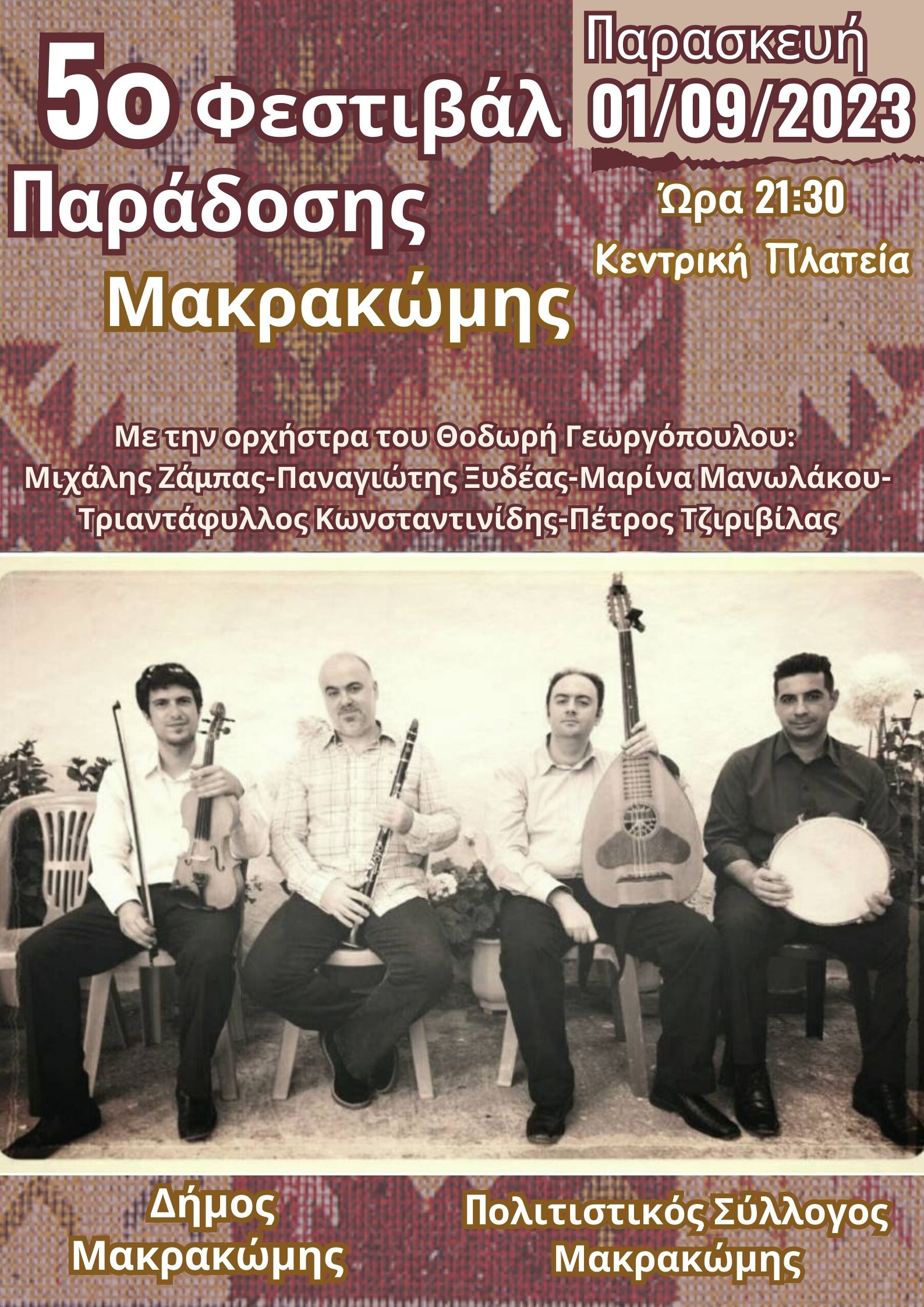 Το 5ο φεστιβάλ παράδοσης στην Κοινότητα Μακρακώμης συνδιοργανώνεται από τον Δήμο Μακρακώμης και τον Πολιτιστικό Σύλλογο Μακρακώμης και θα πραγματοποιηθεί την Παρασκευή 1 Σεπτεμβρίου 2023 στην κεντρική πλατεία της Κοινότητας.